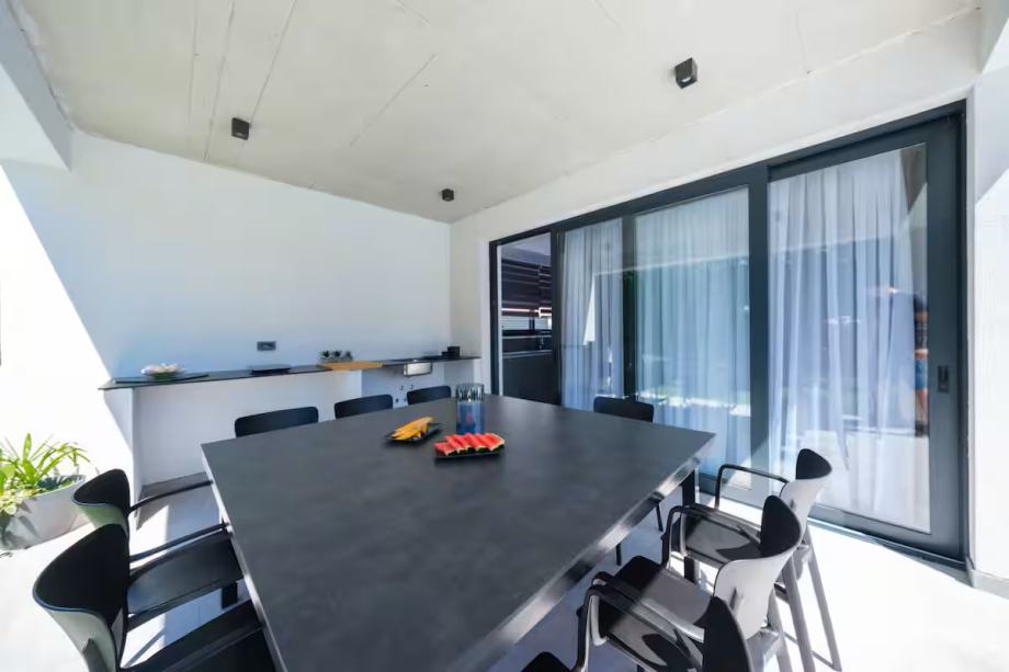 Za vas koji ipak volite biti aktivni, tu je opremljena teretana, tako da formu možete održavati i tijekom odmora. Tu je čak i plinski kamin u kojem ćete zasigurno uživati dok ispijate čašu domaćeg vina. Sav ovaj prostor otvoren je prema bazenu sa staklenim kliznim vratima, tako da ćete osjetiti povjetarac i imati osjećaj jednog ogromnog privatnog prostora. Kada su ova vrata otvorena, možete gotovo doslovno ući u bazen iz svoje dnevne sobe.