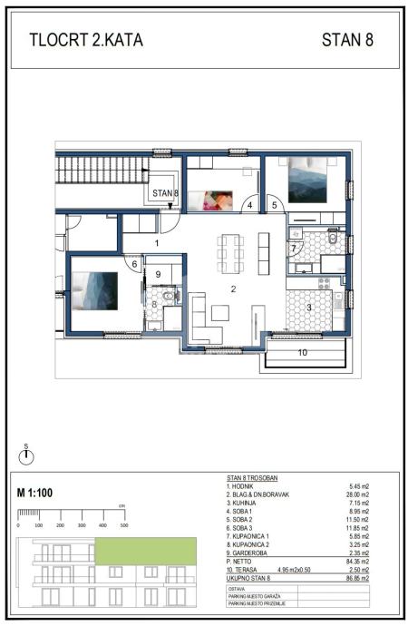Stan površine 84,35 m2 smješten je na drugom katu i sastoji se od prostranog dnevnog boravka i blagavaonice s kuhinjom koji imaju izlaz na balkon od 4,95 m2, kupaonice, tri spavaće sobe od kojih jedna ima vlastitu kupaonicu i garderobu. Ovom stanu pripada jedna ostava u podrumu i dva garažna parkirna mjesta.