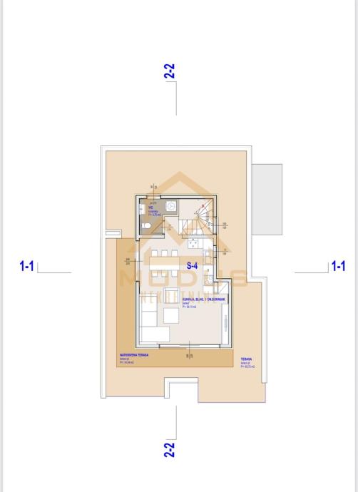 Stan je dvoetažan, na donjoj etaži nalaze se dvije spavaće sobe i dvije kupaonice, te jedan balkon, dok se na gornjoj etaži (nadgrađu) nalazi wc te dnevni boravak, blagavaonica i kuhinja s izlazom na veliku terasu.