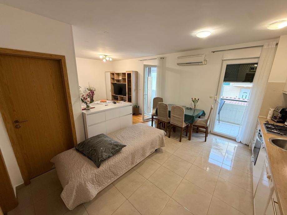 Stan ima 40 m2 i nalazi se u visokom prizemlju stambene zgrade. Sastoji se od open space dnevnog prostora s kuhinjom i blagovaonicom, odvojene prostorije sa ležajem, kupaonice s WC-om te balkon-terase. Prostor je dobro organiziran i omogućava ugodan boravak za više osoba.