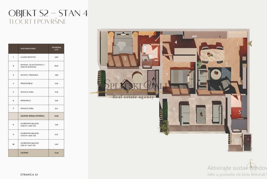 Stan S4 položen je na prvom katu stambene zgrade, prostire se na 73.39m2 netto stambene površine, a sastoji se od kuhinje s blagovaonicom i dnevnim prostorom, kupaonice, ostave/praonice, predsoblja, dvije spavaće sobe, garderobe te čak tri natkrivena balkona.