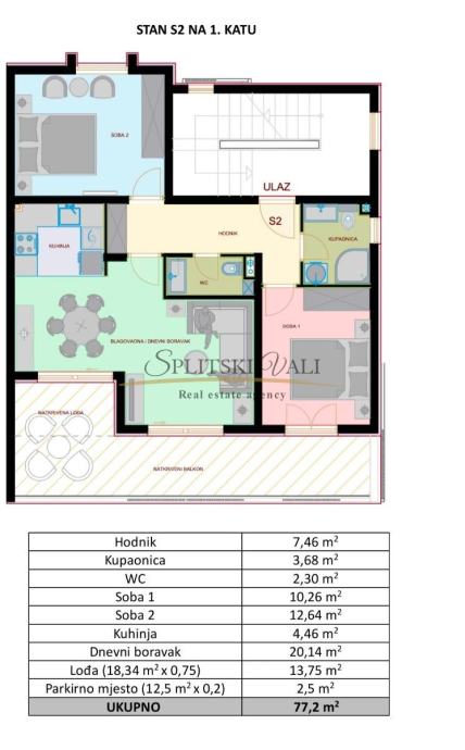 Stan A2- smješten na 1.katu zgrade, sastoji se od: hodnika, kupaonice, wc-a, dvije spavaće sobe, kuhinje s blagovaonicom, dnevnog boravka, lođe, parkirnog mjesta ukupne površine 91,78m2.