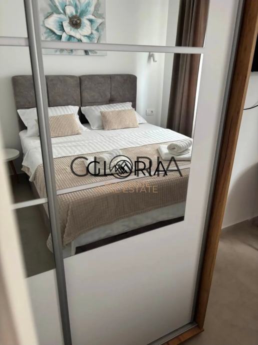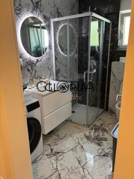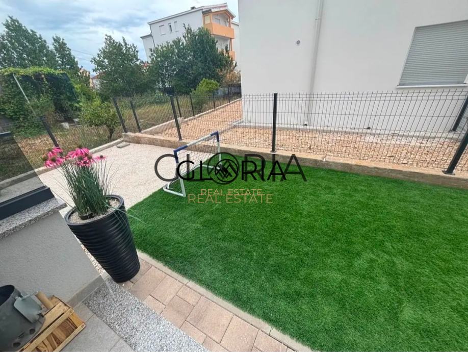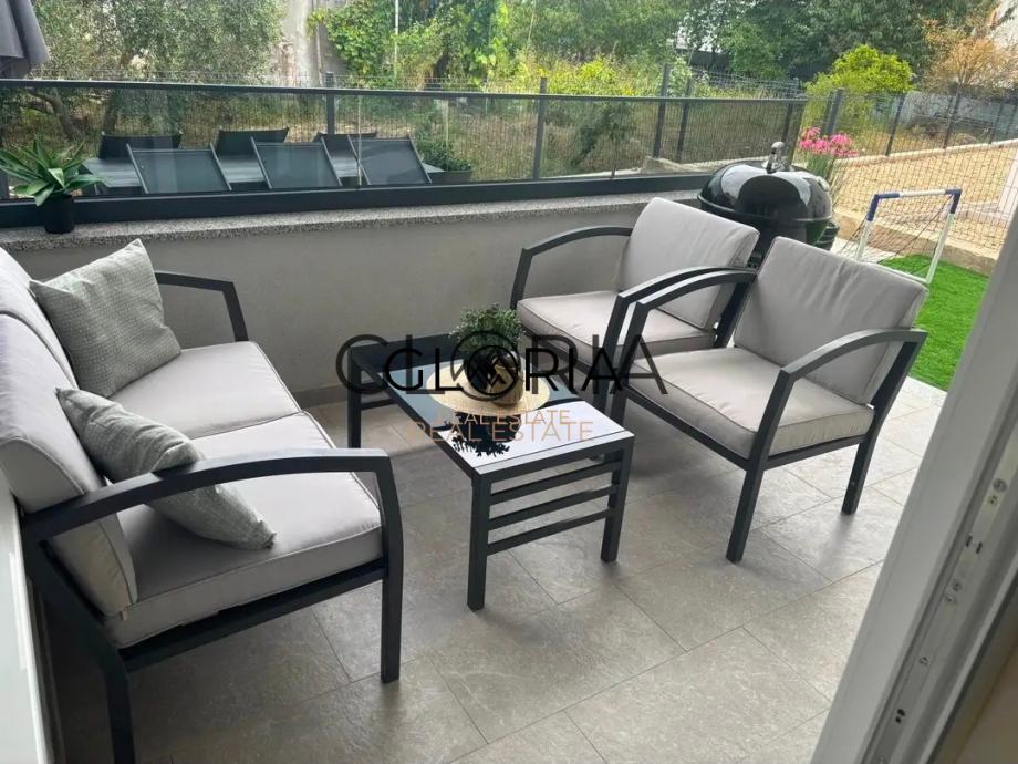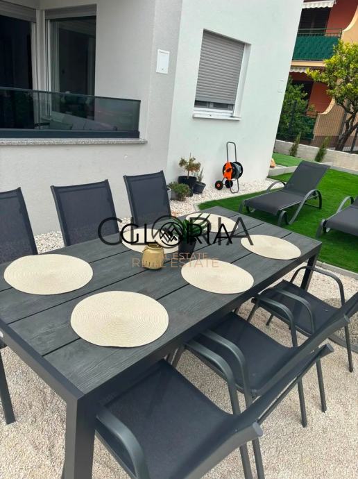 Ovaj stan odlikuje se suvremenim dizajnom i pažljivo uređenom okućnicom - vrt površine 90 m2, pružajući idealan spoj funkcionalnosti i estetike. Prostor je orijentiran prema zapadu i jugu, što omogućuje obilje prirodnog svjetla tijekom dana i ugodnu atmosferu. Stan je opremljen modernom kuhinjom s aparatima, perilicom posuđa, perilicom rublja, TV-om, krevetom i radnim stolom, što dodatno doprinosi udobnosti svakodnevnog života.