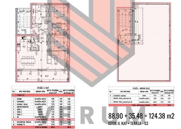 Objekt obuhvaća ukupno 6 stanova i 4 poslovna prostora, površina od 27,88 m² do 128,26 m².Visoka kvalitetagradnje i opreme uključuje:keramičke pločice 1. klase u kupaonici, WC-u i kuhinjiparket u dnevnom boravku i spavaćim sobamapodno grijanje u kupaonici, WC-u, hodniku, kuhinji i dnevnom boravkuklima uređaj za dodatni komforpripadajuće parkirno mjesto uključeno u cijenu.