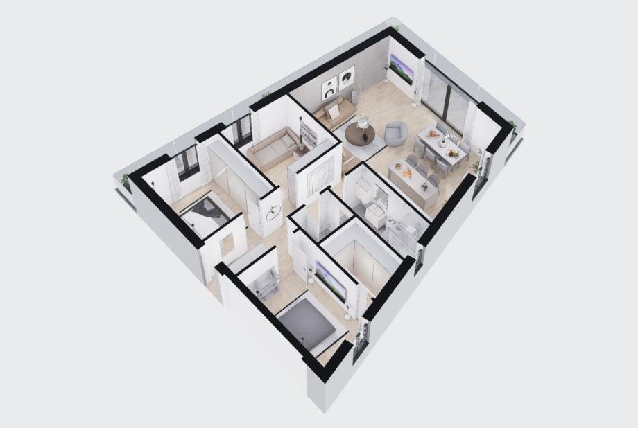 Zgrada se sastoji od suterena na kojem je smještena garaža za tri vozila, te prizemlja i dva kata na kojima se nalazi ukupno osam stanova. U ponudi su jednosobni i dvosobni stanovi te jedan prostrani trosobni stan. Svi stanovi projektirani su moderno, s naglaskom na maksimalnu iskoristivost prostora i funkcionalan raspored.