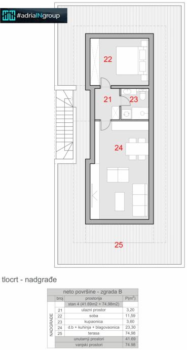 - PENTHOUSE (nadgrađe / treći kat) jednosoban stan: