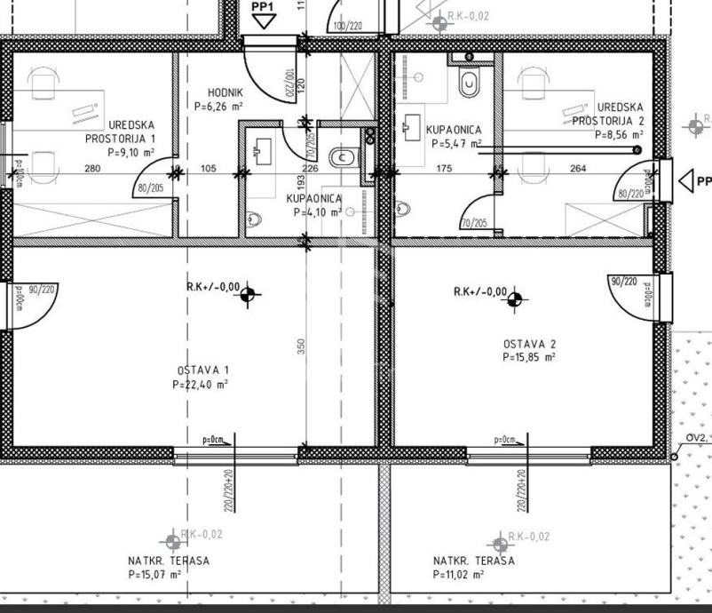 Prostor se sastoji od hodnika, kupaonice s wcom 5,47 m2, uredskog prostora 1 od 8,56 m2, uredskog prostora 2 od 15,85 m2, te natkrivene terase od 11,02 m2.