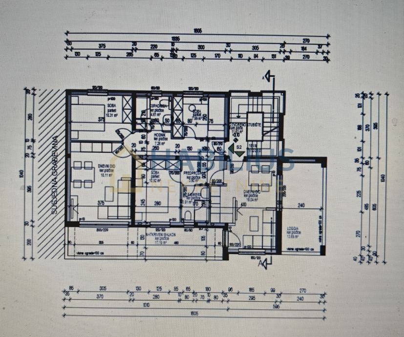 Unutrašnjost ovog stana odlikuje se odlično osmišljenim rasporedom prostorija koji se može koristiti kao jedan veliki četverosobni, ili kao dva odvojena stana. Stanu pripada veliki južni balkon od 18 m2, kao i lođa od 14 m2 na istoku. U slučaju korištenja stana kao dva manja, oba bi imala svoj vlastiti balkon (lođu). Stanu također pripadaju i dva parkirna mjesta. Odlična prilika za kvalitetan i miran život.