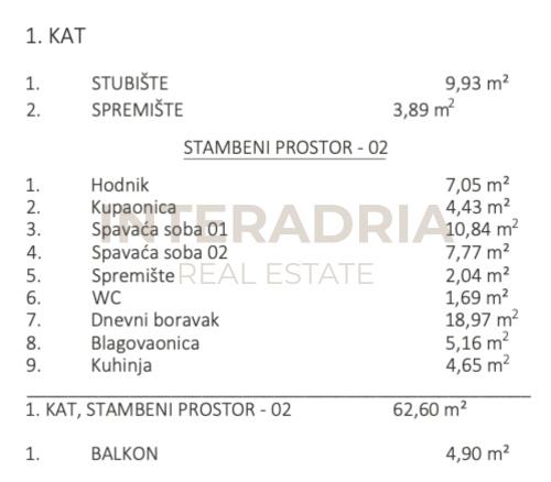 Sastoji se od 2 spavaće sobe, prostranog dnevnog boravka, kuhinje i blagovaonice, kupaonice s WC-om, dodatnog WC-a, spremišta te balkona površine 5 m².