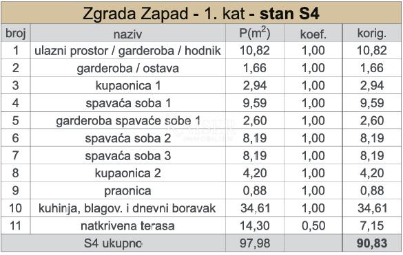 Stan, oznake S4, nalazi se na prvom katu zapadne zgrade. Ukupna neto korisna površina stana iznosi 90,83 m². Pažljivo je projektiran kako bi se naglasili otvoreni, svijetli prostori i besprijekorna povezanost s prirodnim okruženjem.