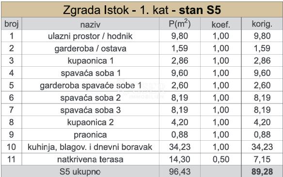 Stan, oznake S5, nalazi se na prvom katu istočne zgrade. Ukupna neto korisna površina stana iznosi 89,28 m². Pažljivo je projektiran kako bi se naglasili otvoreni, svijetli prostori i besprijekorna povezanost s prirodnim okruženjem.