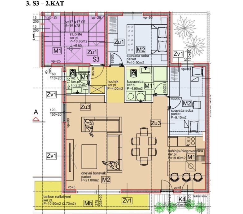 Kaštela Stari, B-S3 comfortable two-bedroom apartment of 83.7 m2 located in a new building on the 2nd floor with an associated parking space.It consists of: a comfortable open-plan living room with kitchen and dining room, two bedrooms, bathroom, toilet, hallway, balcony adjacent to the...