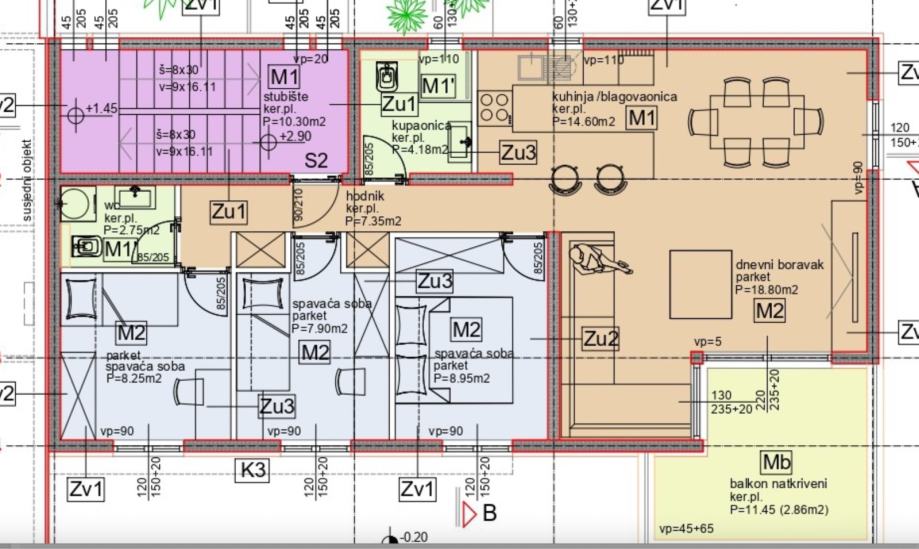 Kaštela Stari, B-S2 comfortable three-bedroom apartment of 89.4 m2 located in a new building on the 1st floor with an associated parking space.It consists of: a comfortable open-plan living room with kitchen and dining room, three bedrooms, bathroom, toilet, hallway and terrace in front of the...