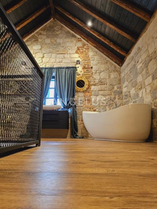 Stropovi su obloženi drvenim gredama koje privlače pogled prema visokim stropovima, a moderni elementi dodatno povećavaju vrijednost ove prekrasne povijesne kuće.