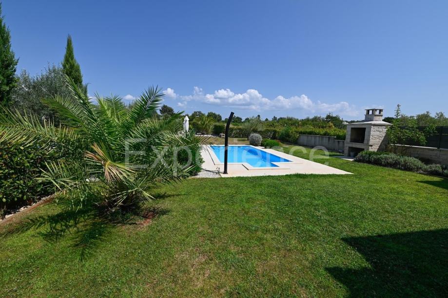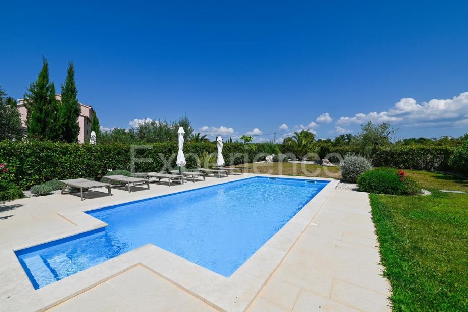 Pomno uređeno dvorište sa raznim mediteranskim biljem, bazen i sunčalište čini oazu koja pruža otvoreni pogled na prirodu.