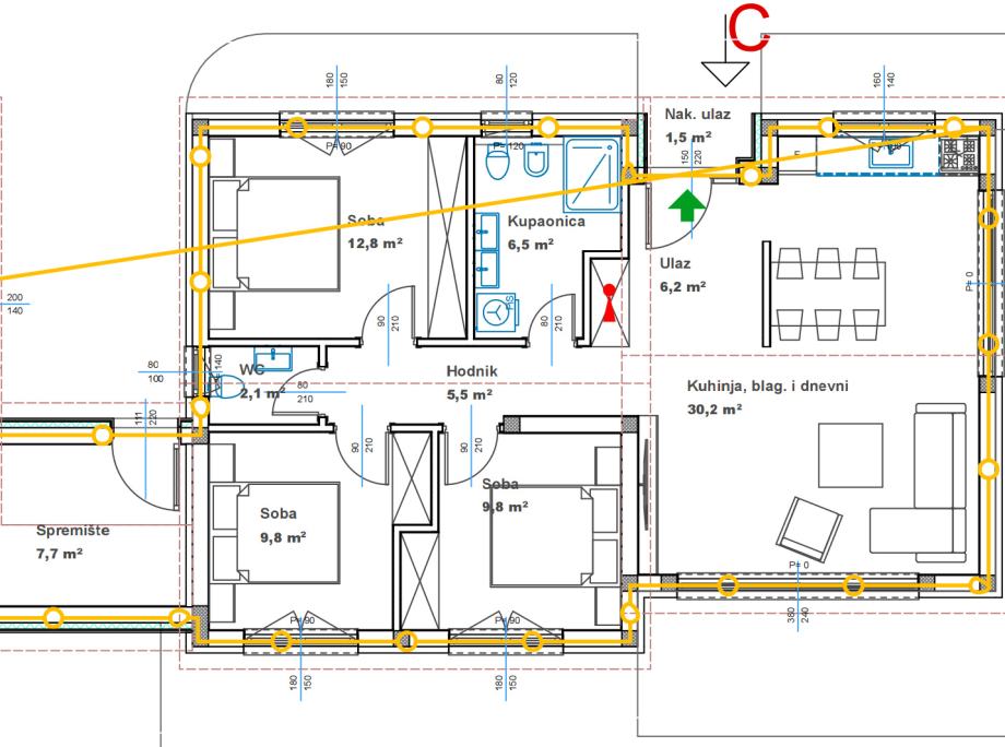 3 spavaće sobe, 1 kupaonice s WC-om i odvojeni WC.