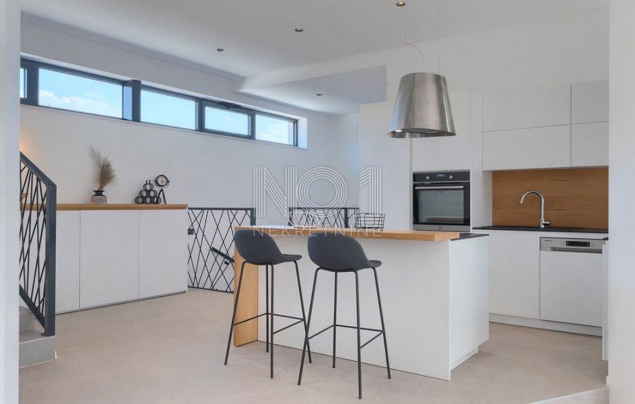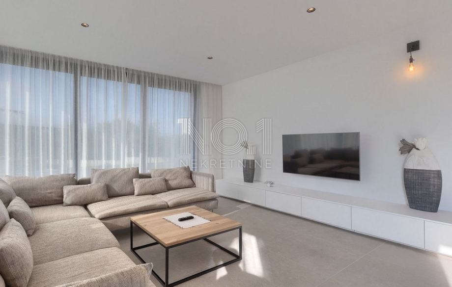 Vila je prostrana i svijetla, s pažljivo odabranim modernim namještajem i opremom koji kombiniraju udobnost i eleganciju. Svaka soba ima veliki prozor koji omogućava obilje prirodnog svjetla, a iz dnevnog boravka i terasa pruža se očaravajući pogled na Jadransko more.