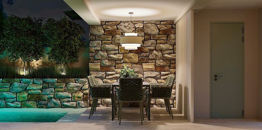 Posjed je ograđen kamenim zidom koji osigurava privatnost i mir, dok će bujno zelenilo biti zasađeno kao prirodna živica. Vrt i prizemlje bit će ukrašeni autohtonim istarskim kamenom, a vanjska stolarija bit će izrađena od drveta, naglašavajući skladan spoj tradicije i suvremenog dizajna.