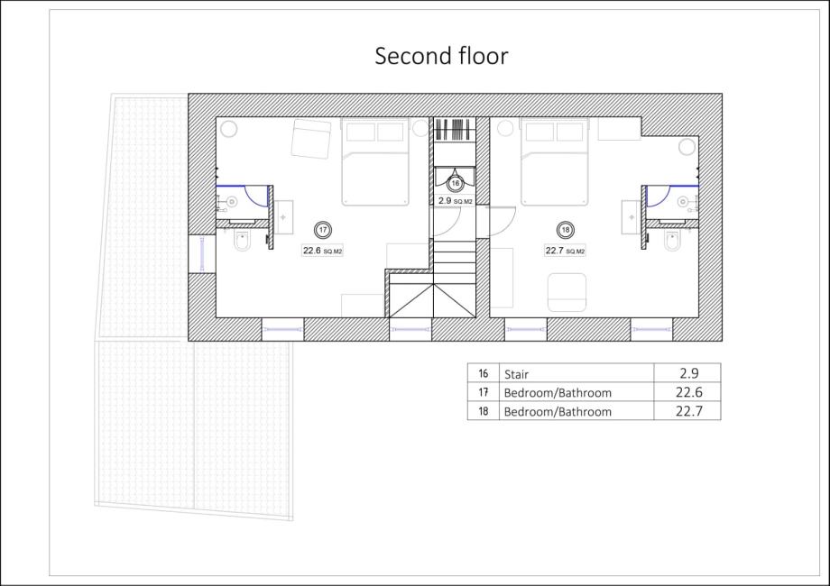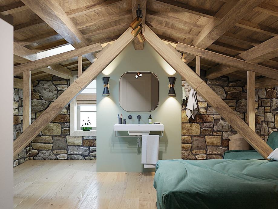 Visoko potkrovlje sadrži dvije dodatne spavaće sobe, svaka s vlastitom kupaonicom, pružajući privatnost i udobnost za obitelj i goste.