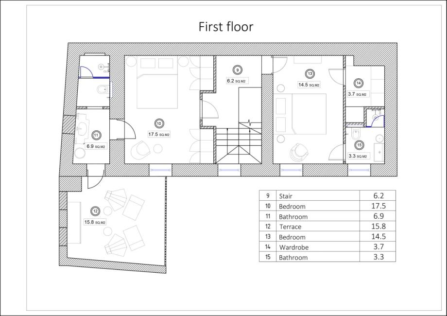 Unutarnje stubište vode na prvi kat, gdje su smještene dvije prekrasno uređene spavaće sobe, svaka sa svojom kupaonicom. Jedna od spavaćih soba ima pristup natkrivenoj terasi, savršenoj za uživanje u mirnim trenucima na otvorenom.