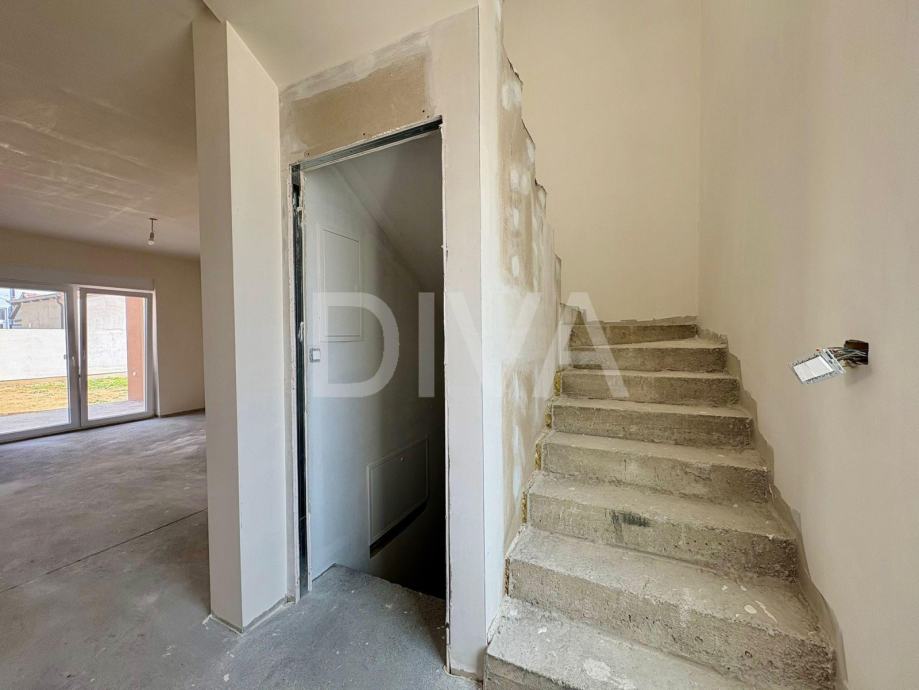 Hodnik i stubište, WC, kuhinja s blagovaonicom i dnevnim boravkom u open space konceptu, ostava ispod stubišta, terasa te garaža s direktnim ulazom u kuću.