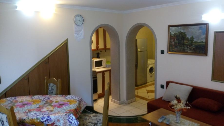 Apartman na prvoj etaži sa terasom i galerijom 2 ležaja , a prizemlje sa dvije manje sobe za spavanje 2+2 ležaja .