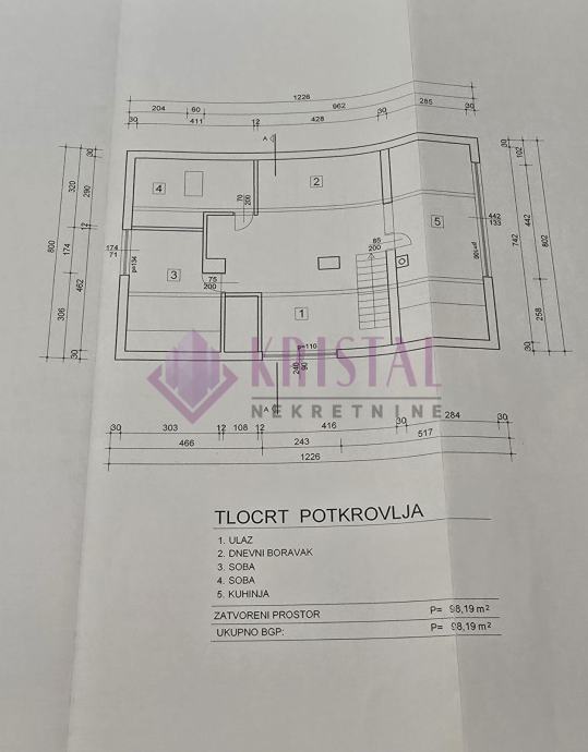 Potkrovlje se sastoji od: kuhinja i blagovaona, dnevni boravak, 2 spavaće sobe.