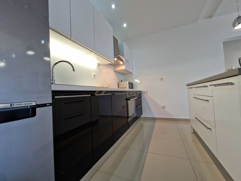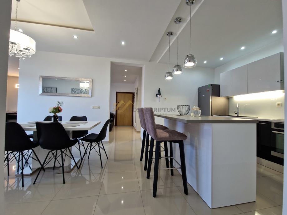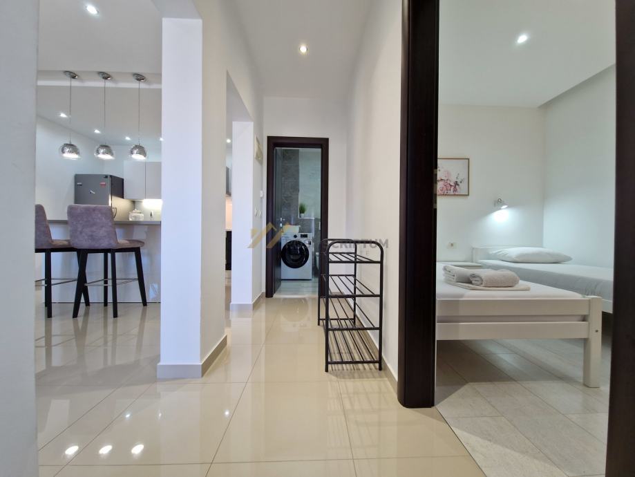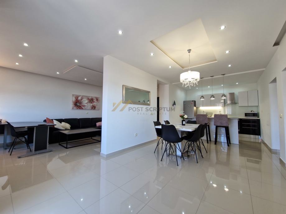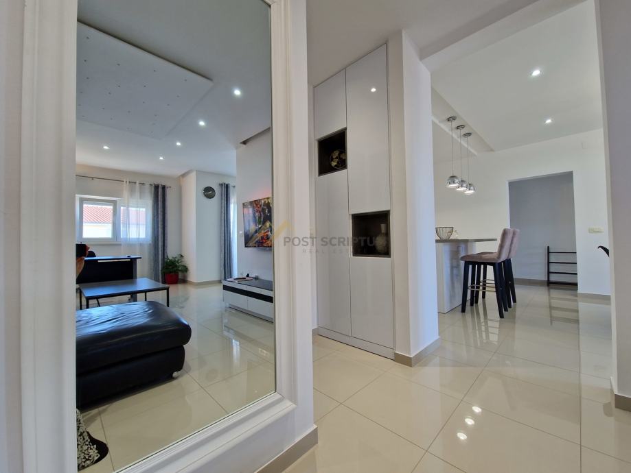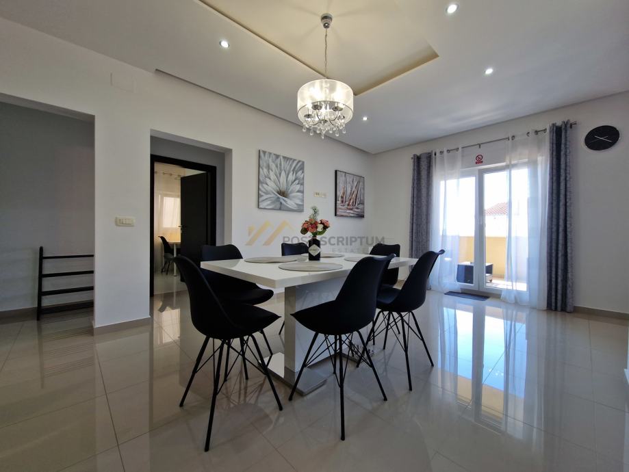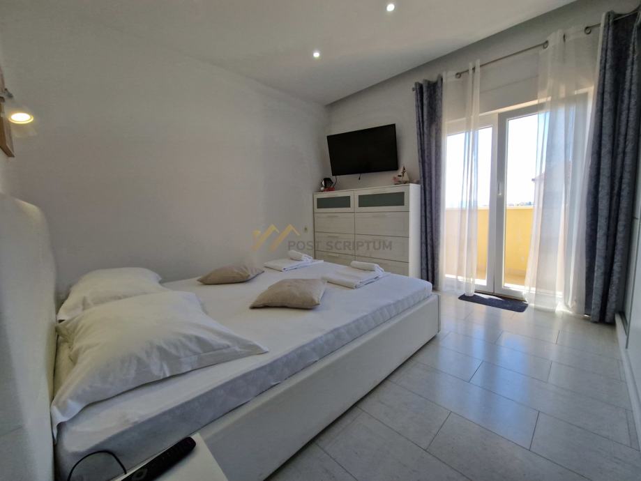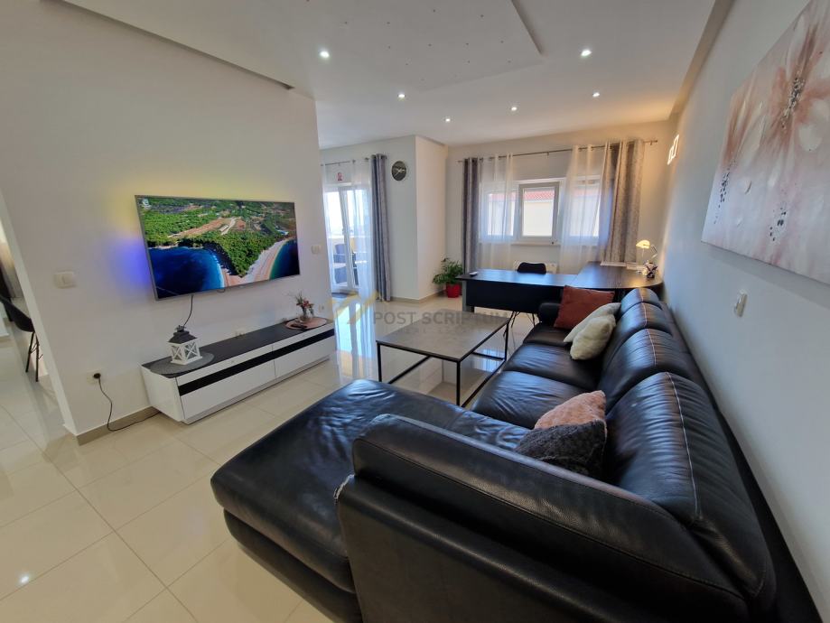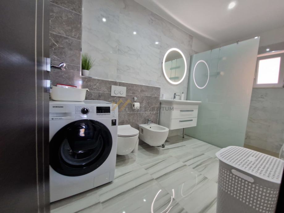 Stan je vrlo prostran, lijepog i modernog uređenja, klimatiziran, potpuno namješten i opremljen svim uređajima (TV, klima, perilica rubljla, perilica posuđa).