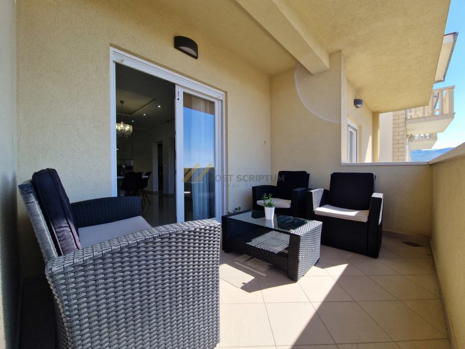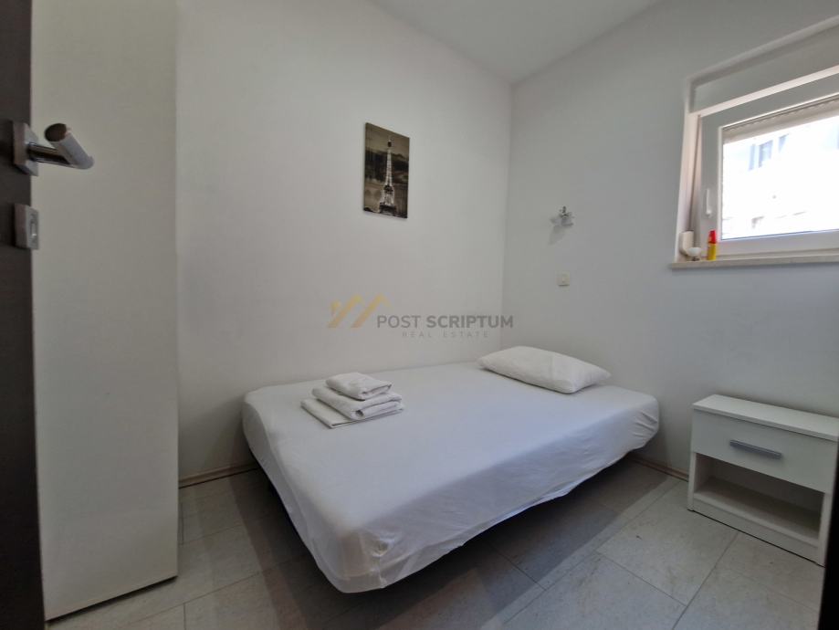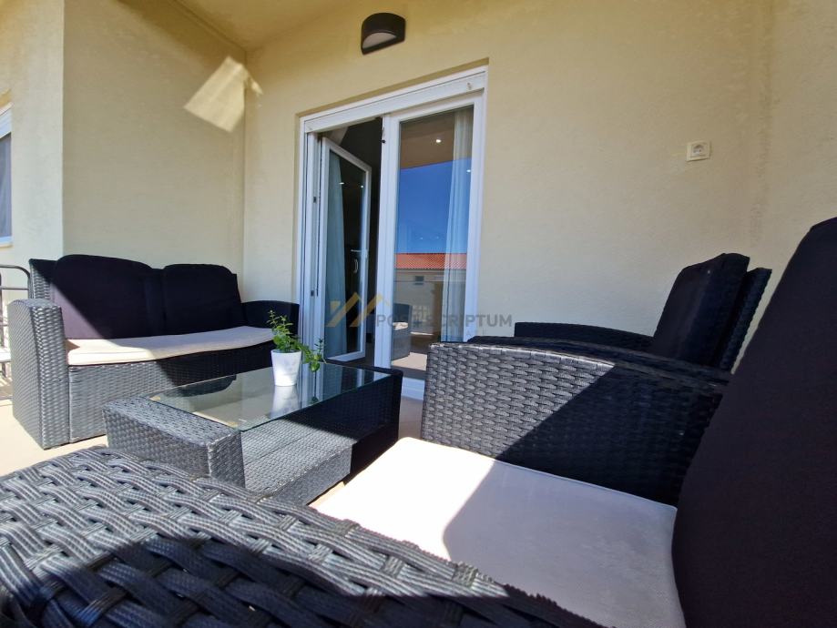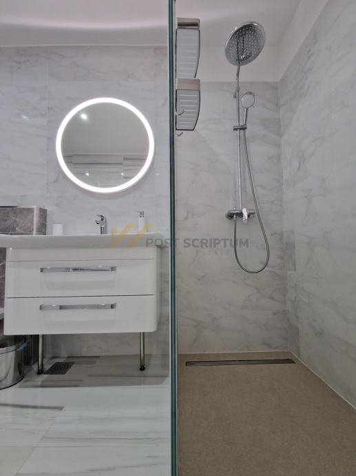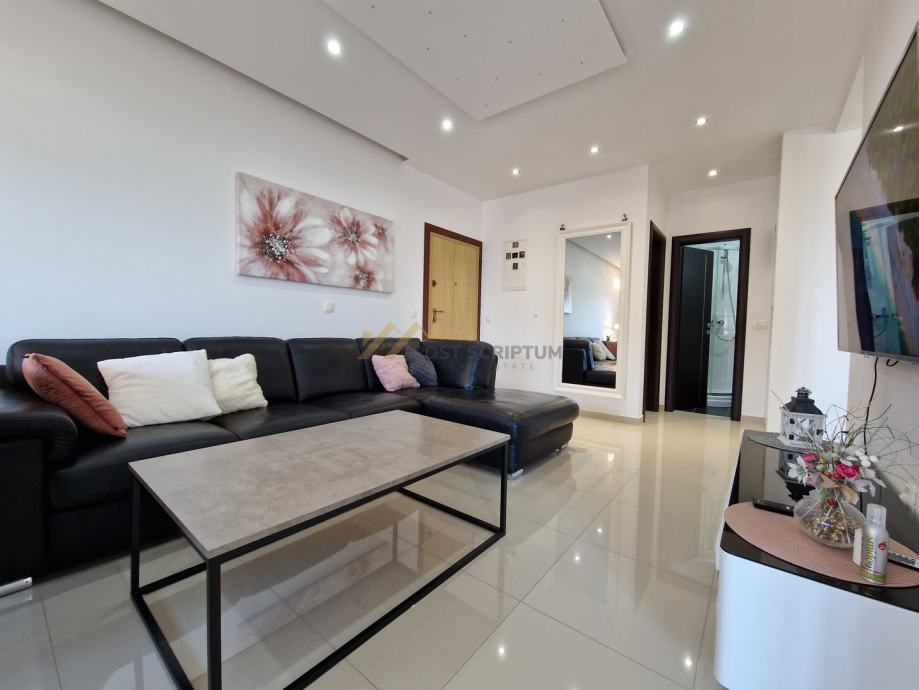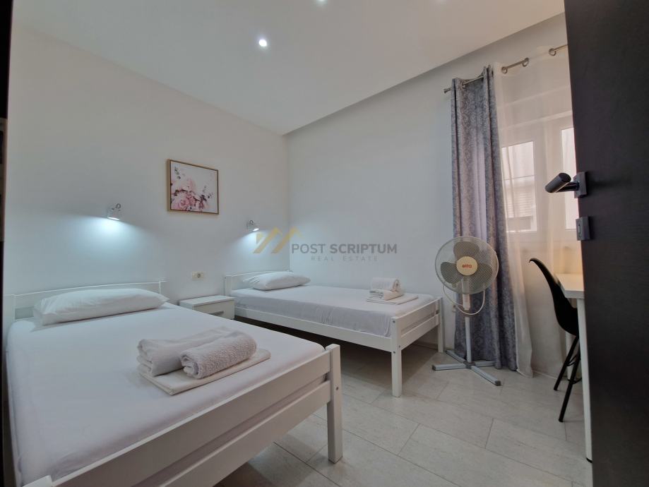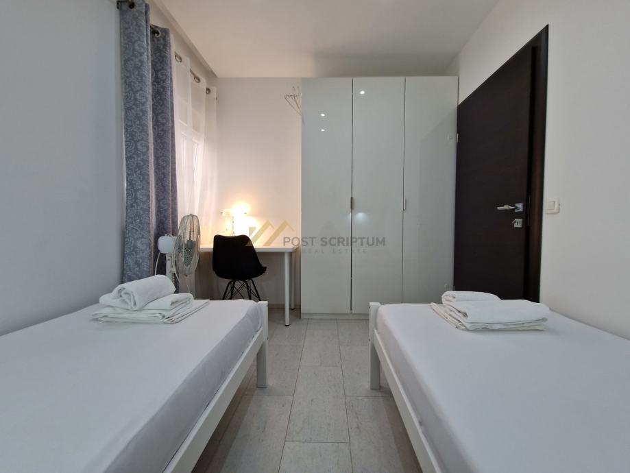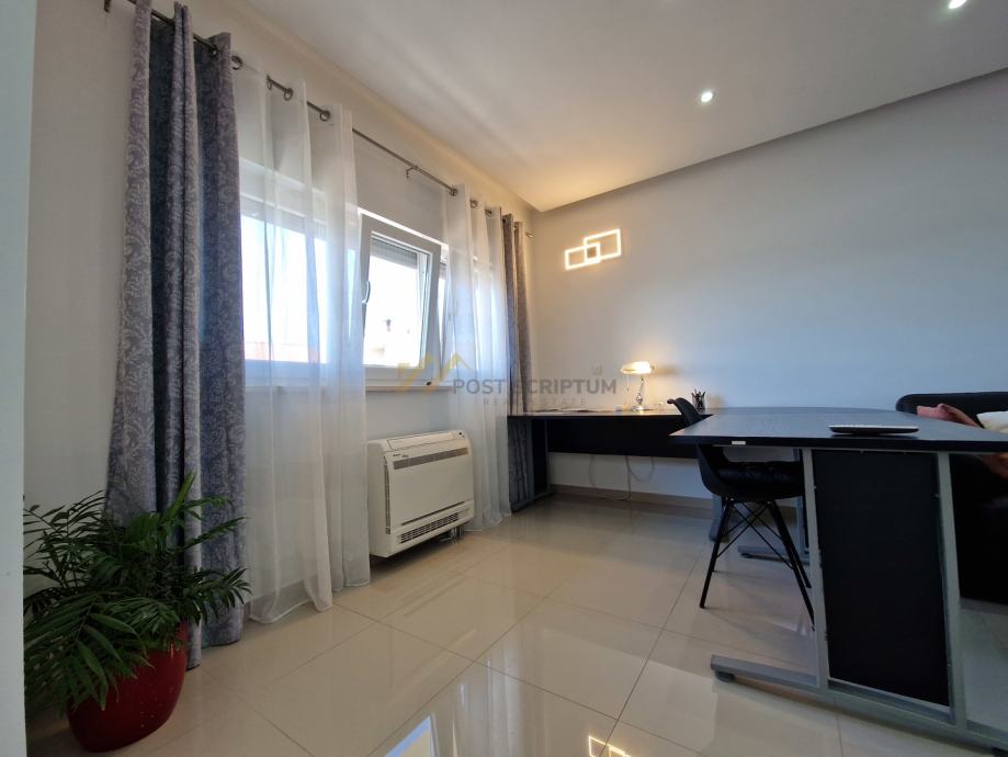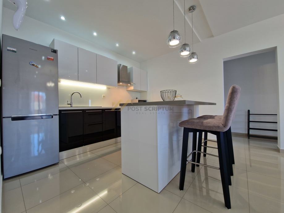 Stan je vrlo prostran, lijepog i modernog uređenja, klimatiziran, potpuno namješten i opremljen svim uređajima (TV, klima, perilica rubljla, perilica posuđa).