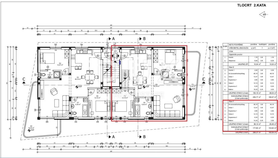 U toj zgradi na prodaju je dvoetažni stan F koji se dijelom nalazi na drugom katu, a dijelom u potkrovlju.