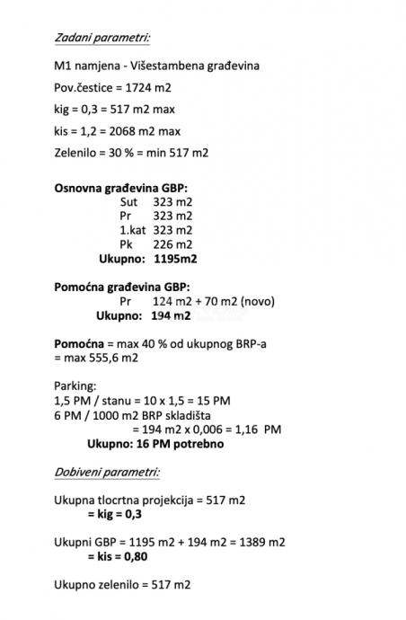 Starina se nalazi na čestici površine 1,725 m2 te ista ima projekt za višestambenu zgradu s 8 stanova, 1 poslovnim prostorom te 16 parkirnih mjesta.