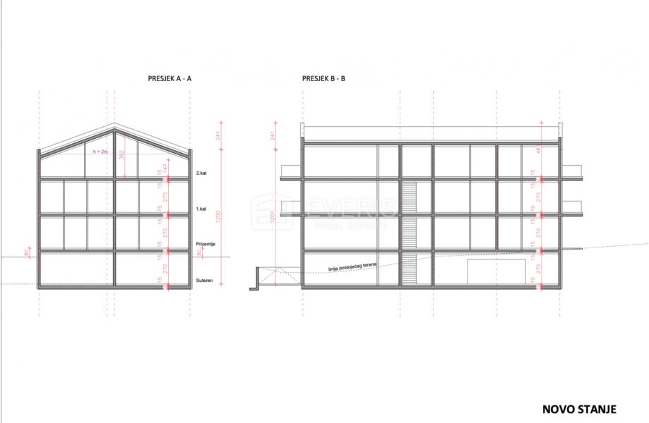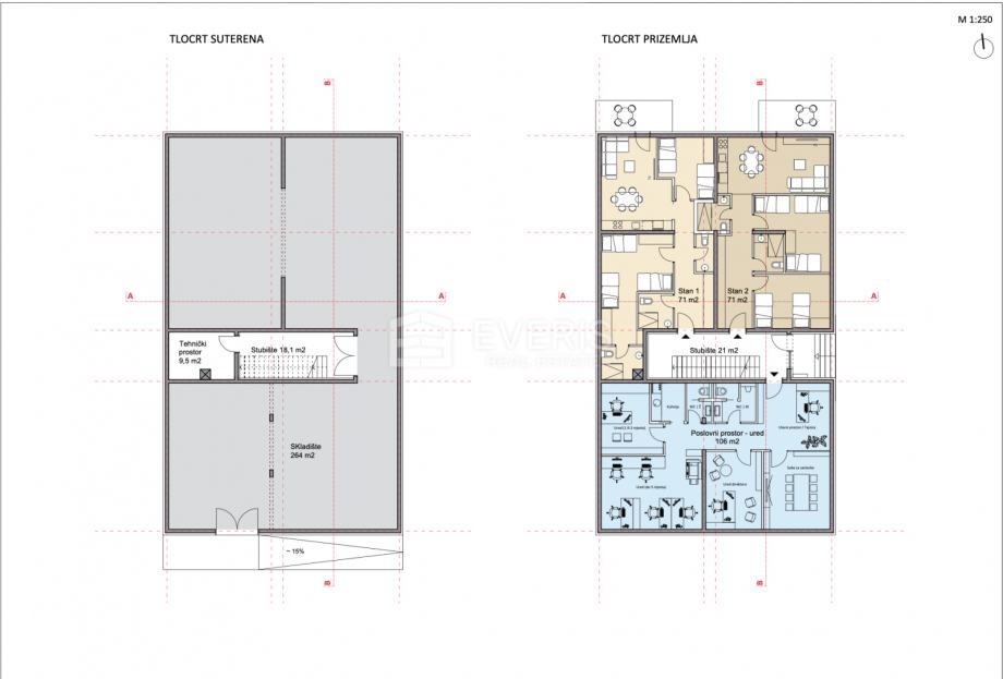 - Prizemlje: stubište, dva stana, svaki površine 71 m2 te poslovni prostor- ured - površine 106 m2.