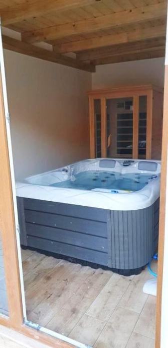 Vanjski dio imanja nudi potpuni mir i privatnost: bazen dimenzija 3,7 × 9 m s prostranim sunčalištem, ležaljkama i suncobranima, zatvoreni jacuzzi za tri osobe, sjenica s roštiljem te natkriveni prostor za blagovanje i druženje. Okućnica je pažljivo uređena, popločana i redovito održavana, s privatnim parkingom za više vozila.