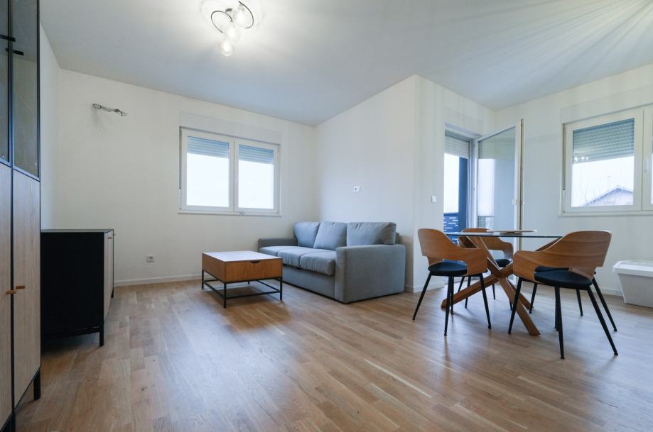 Daje se u najam atraktivan 3-soban stan na 1.katu novoizgrađene manje stambene zgrade, u naselju Sveta Klara u Novom Zagrebu. PRVI NAJAM!