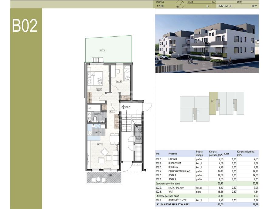 Stan oznake B02, trosoban, nalazi se u visokom prizemlju te se sastoji od: hodnika, kupaonice, dnevnog boravka sa blagovaonicom i kuhinjom, te dvije sobe, ukupne stambene površine 55,77m2, balkona od 6,13m2 (obračunski 3,07m2), vrta od 18,36m2 (obračunski 1,84), spremišta od 2,29m2 (obračunski 1,72m2), te jednog vanjskog parkirnog mjesta od 14,00m2 (obračunski 3,5m2). Ukupna prodajna površina je 65,55m2.