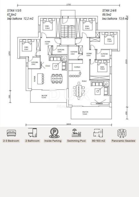 Sastoji se od ulaznog hodnika, open space prostora u kojem je kuhinja sa blagavaonom i dnevnim boravkom, balkona, 2 prostrane spavaće sobe od kojih jedna ima kupaonicu i jedne velike kupaonice. Iz dnevnog boravka izlazi se na balkon s pogledom na more. Ispred zgrade nalazi se parking za vozila.