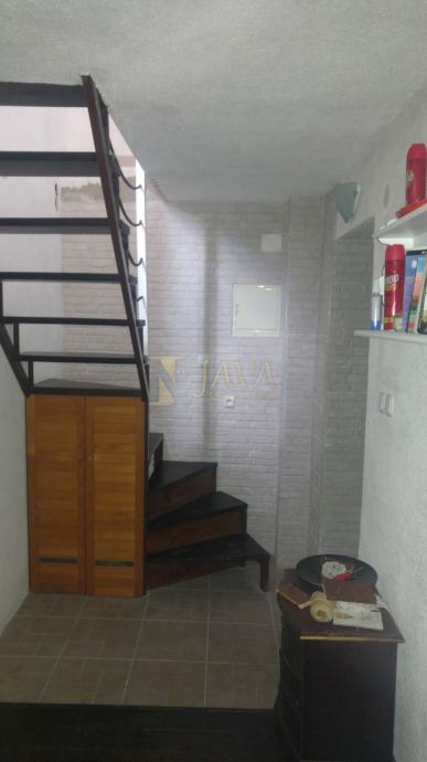 Donja etaža sadrži dnevni boravak i kuhinju u toplom, rustikalnom stilu, kupaonicu te praktično spremište.