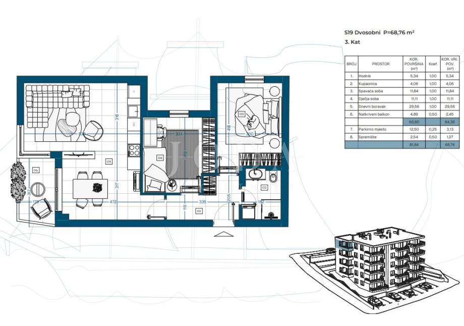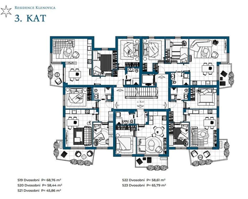 Stan S19 na trećem katu ima 68,13 m². Viša etaža osigurava više svjetlosti i privatnosti.