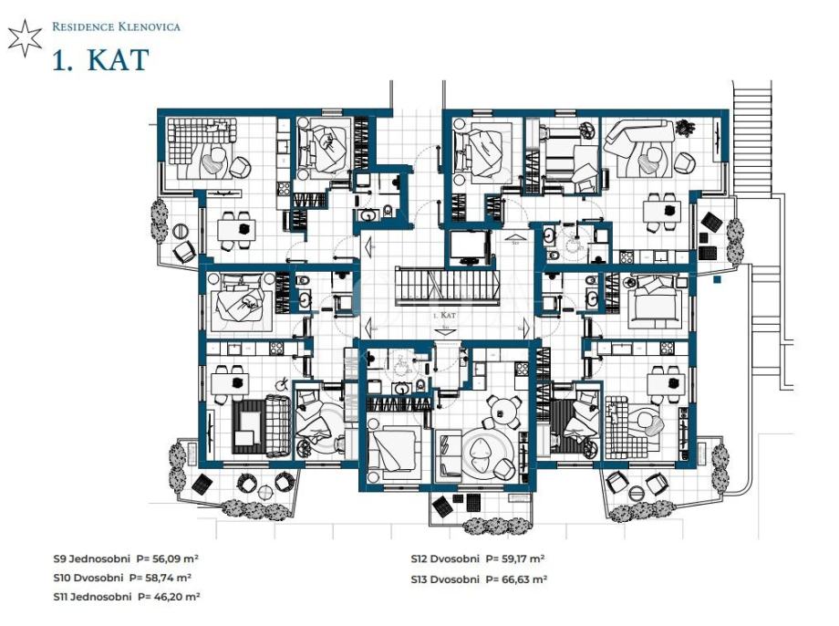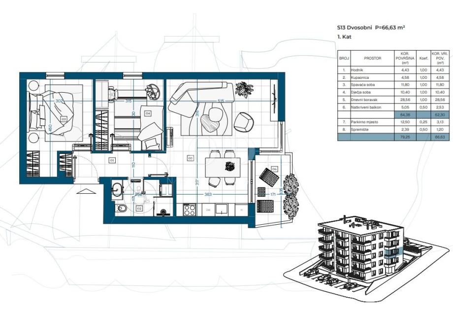 Stan S13 površine 65,53 m² pruža dodatni komfor i prostranost, idealan za obiteljski život.