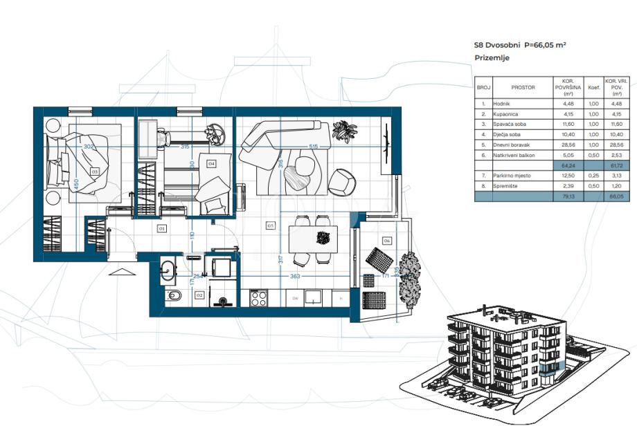 Stan S8 ima ukupno 65,41 m² obračunske površine. Veća kvadratura pruža dodatnu udobnost i prostranost. Uključeni su ostava i parking.