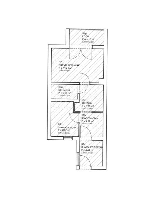 Ukupna površina stana iznosi 59,69 m². Unutarnji raspored obuhvaća ulazni prostor, kuhinju s blagovaonicom, dnevni boravak, spavaću sobu i kupaonicu, te ima stambenu površinu 37,02 m2. Stan je zapadne orijentacije, čime je osiguran predivan pogled na zalaske sunca.