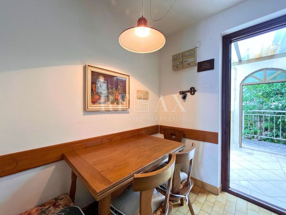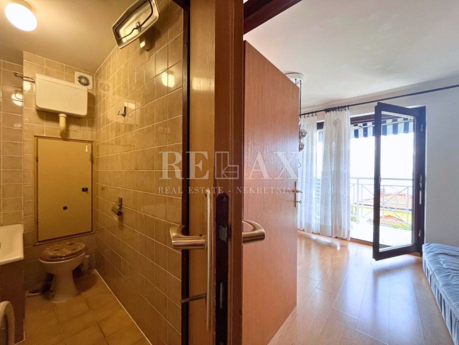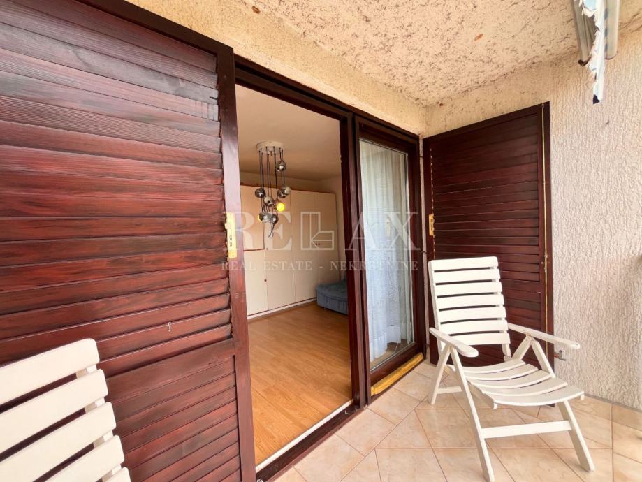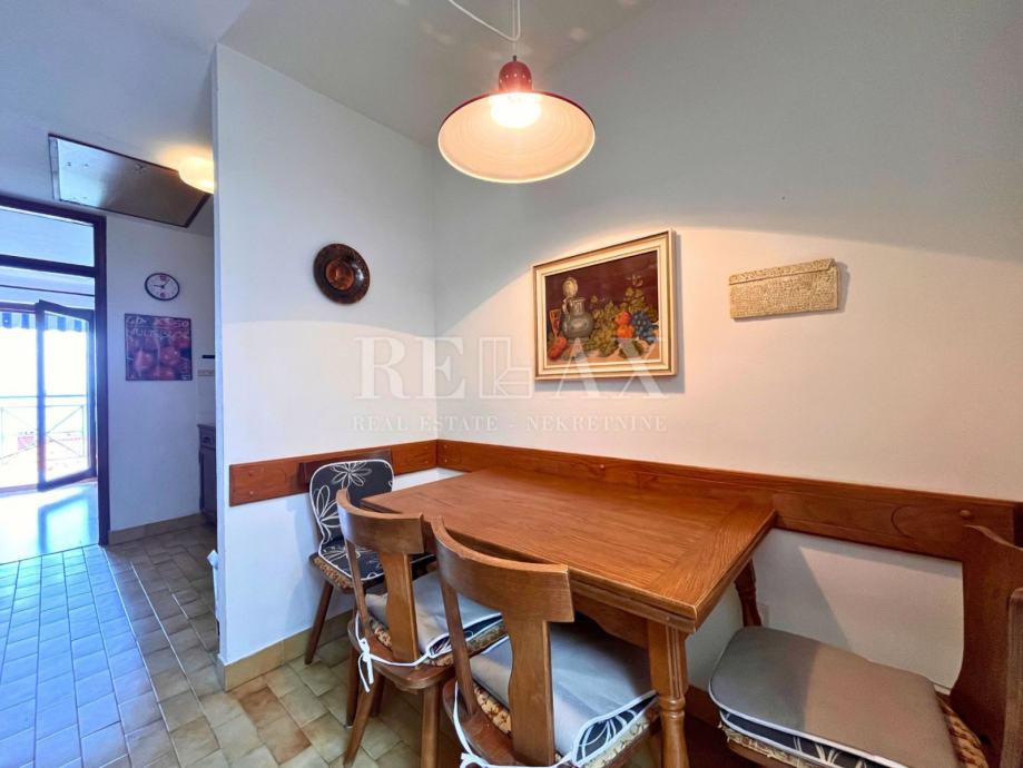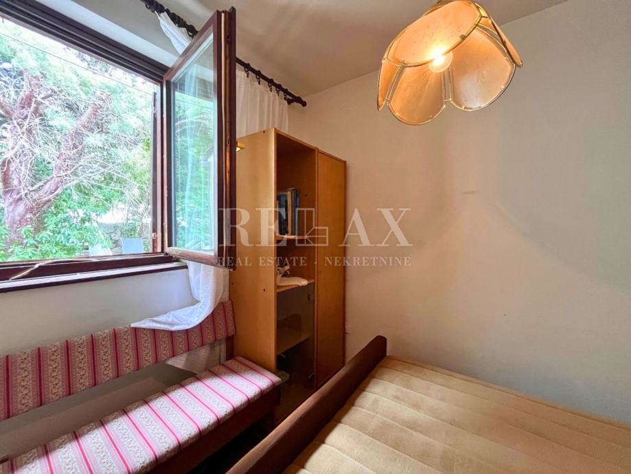 Iz dnevnog boravka izlazi se na loggiu s pogledom na more, idealnu za opuštanje i boravak na otvorenom. Stanu dodatno pripada i vanjsko stubište površine 5,05 m2, lijepo održavani vrt površine 13,32 m², kao i dvije ostave – jedna u prizemlju koja može služiti kao drvarnica i druga u potkrovlju. Potkrovlje nudi potencijal za dodatno uređenje u stambeni prostor. Postoji mogućnost parkiranja na javnoj površini ispred objekta.