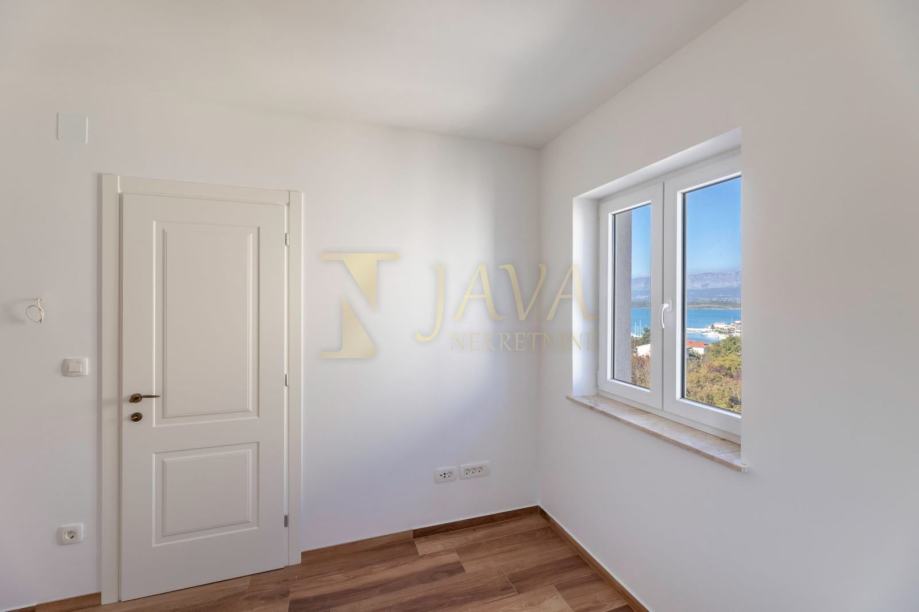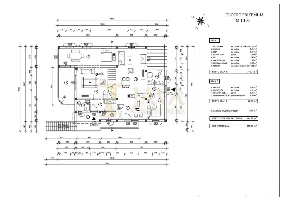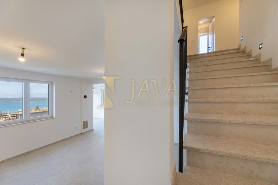 * Veća stambena jedinica (159 m2) na prvoj etaži ima prostrani dnevni boravak, otvorenu blagovaonicu i kuhinju s terasom (pogled na uvalu), ostavu, WC i ured s vanjskim ulazom (na terasu i parkirng)