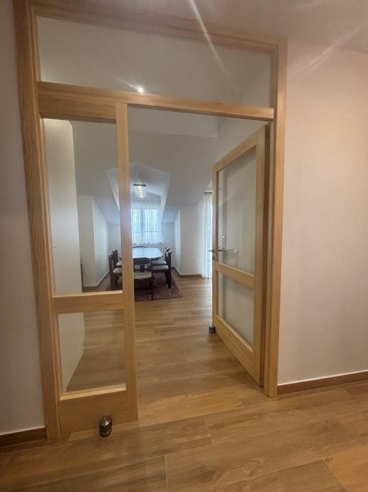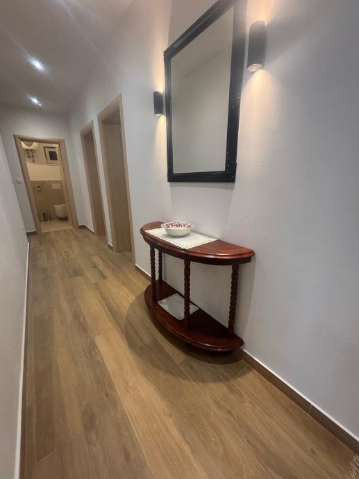 Stan je smješten na 2.katu novije obiteljske kuće. Sastoji se od: hodnika, predprostora, 2 kupaonice, 3 spavaće sobe od kojih je jedna velika bračna soba, kuhinje sa blagovaonicom i dnevnim boravkom, balkona i terase. Ukupno stan ima 90m2 stambenog prostora + terasu te mogućnost najma garaže veličine 20m2. Cijena mjesečnog najma garaže iznosi 50€ te nije vezana uz najam stana ukoliko nema potrebe za njom. Uređen i spreman za useljenje. Stan je kompletno opremljen malim i velikim kućanskim aparatima.