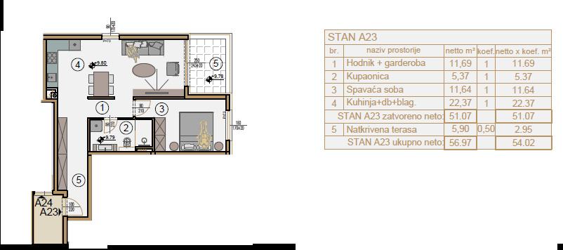 Stan ukupne površine 54,02 m² sastoji se od ulaznog hodnika s garderobnim prostorom, otvorenog koncepta kuhinje, dnevnog boravka i blagovaonice, spavaće sobe te moderne kupaonice. Posebnu vrijednost daje natkrivena terasa, idealna za boravak tijekom cijele godine. Stanu pripada i garažno mjesto smješteno u podzemnoj etaži zgrade.