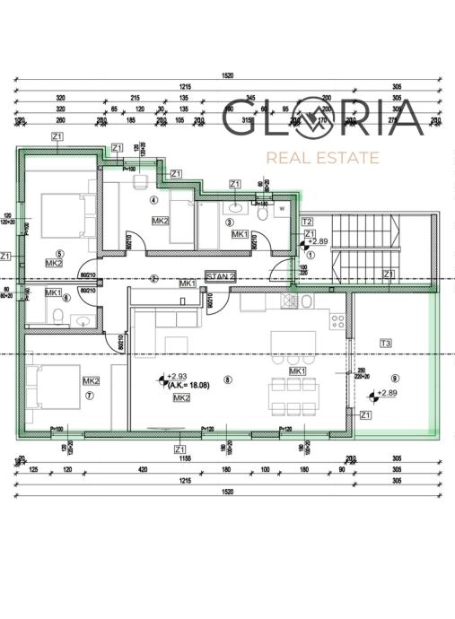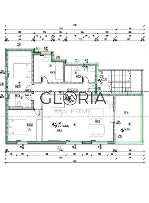 Stan S2 Z3 proteže se na 107,93 m2 i sastoji se od: