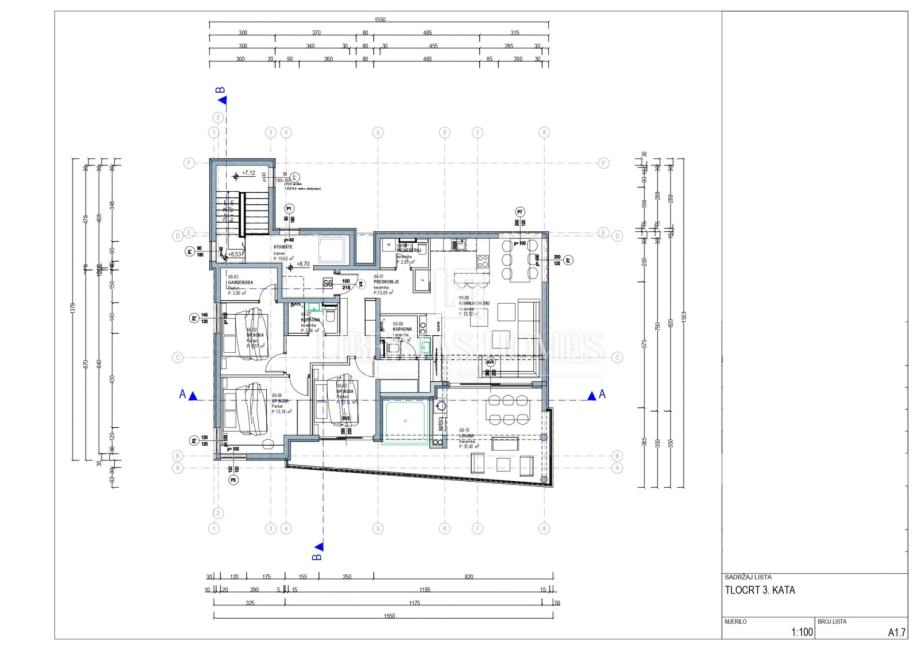 Sastoji se od ulaznog predsoblja, garderobe, dvije kupaonice, toaleta, tri spavaće sobe, te otvorenog dnevnog prostora koji uključuje kuhinju, blagovaonicu i dnevni boravak s izlazom na prostranu loggiu površine 35,40 m² s koje se pruža pogled na more.