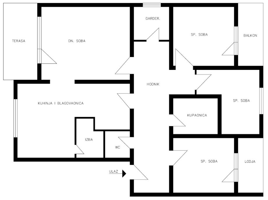 Stan se sastoji od prostranog hodnika, dnevne sobe, koja je povezana s kuhinjom i blagovaonicom, tri odvojene sobe, ostave, kupaonice, toaleta, prostora za garderobu, te lođe ukupne neto korisne površine 101 m2. Stan ima i veću terasu na koju se izlazi iz dnevnog boravka, lođu iz dječje i balkon iz spavaće sobe i ostavu u podrumu zgrade koji nisu uračunati u neto korisnu površinu stana.
