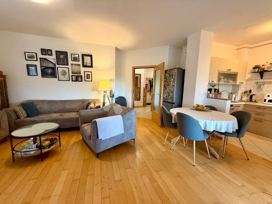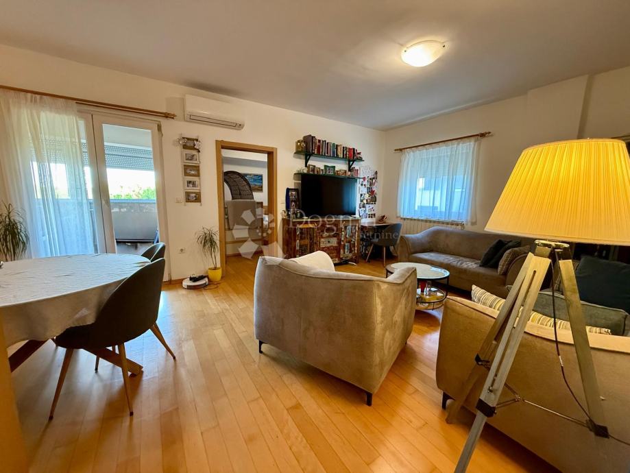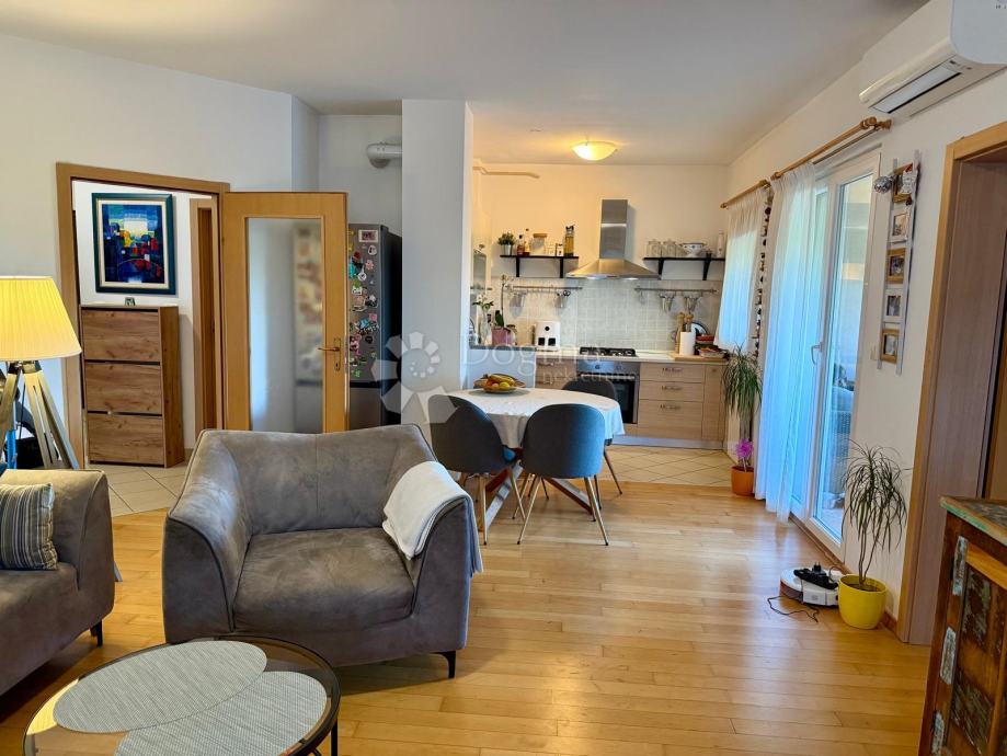 Stan je funkcionalno i moderno uređen, idealan za obiteljski život. Sastoji se od open space dnevnog boravka, blagovaonice i kuhinje s izlazom na prostranu lođu zatvorenu PVC stolarijom, što osigurava privatnost i dodatnu tišinu – savršen prostor za opuštanje i druženje.