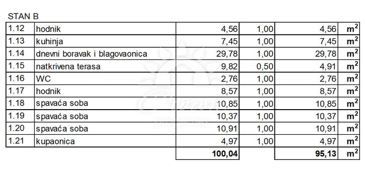 Stan se sastoji od tri komforne spavaće sobe, prozračnog dnevnog boravka povezanog s kuhinjom i blagovaonicom, te kupaonice. Iz dnevnog prostora izlazi se na natkrivenu terasu, koja se nastavlja na veliki privatni vrt površine oko 100 m², idealan za opuštanje, boravak na otvorenom i obiteljski život. Postoji mogućnost ograđivanja vrta, čime se dodatno osigurava privatnost i sigurnost.